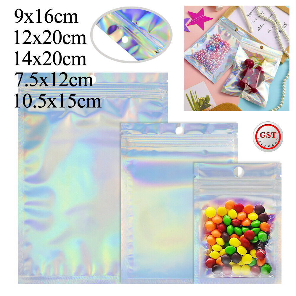 Transparent front design: aluminum foil bags are made of quality metallic film with holographic color, shining and durable; Holographic silver back with transparent front for displaying the items and offering easy identification