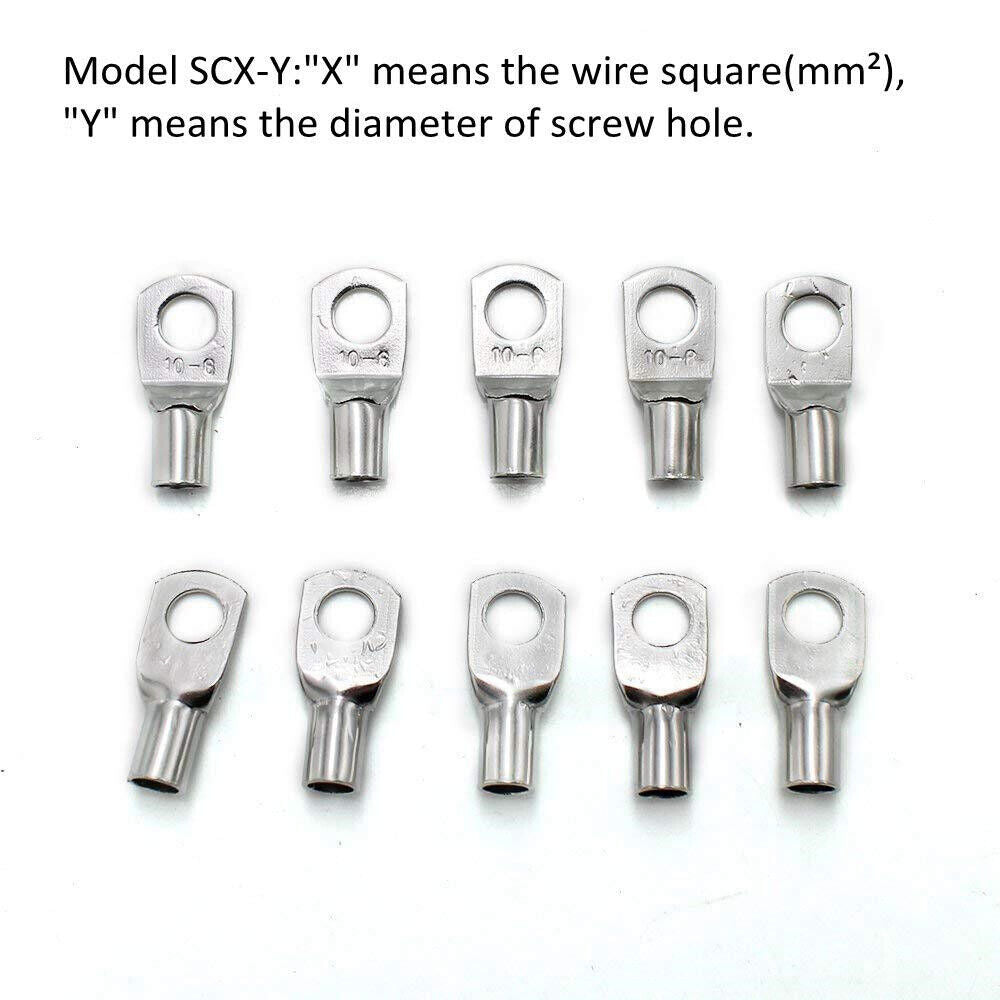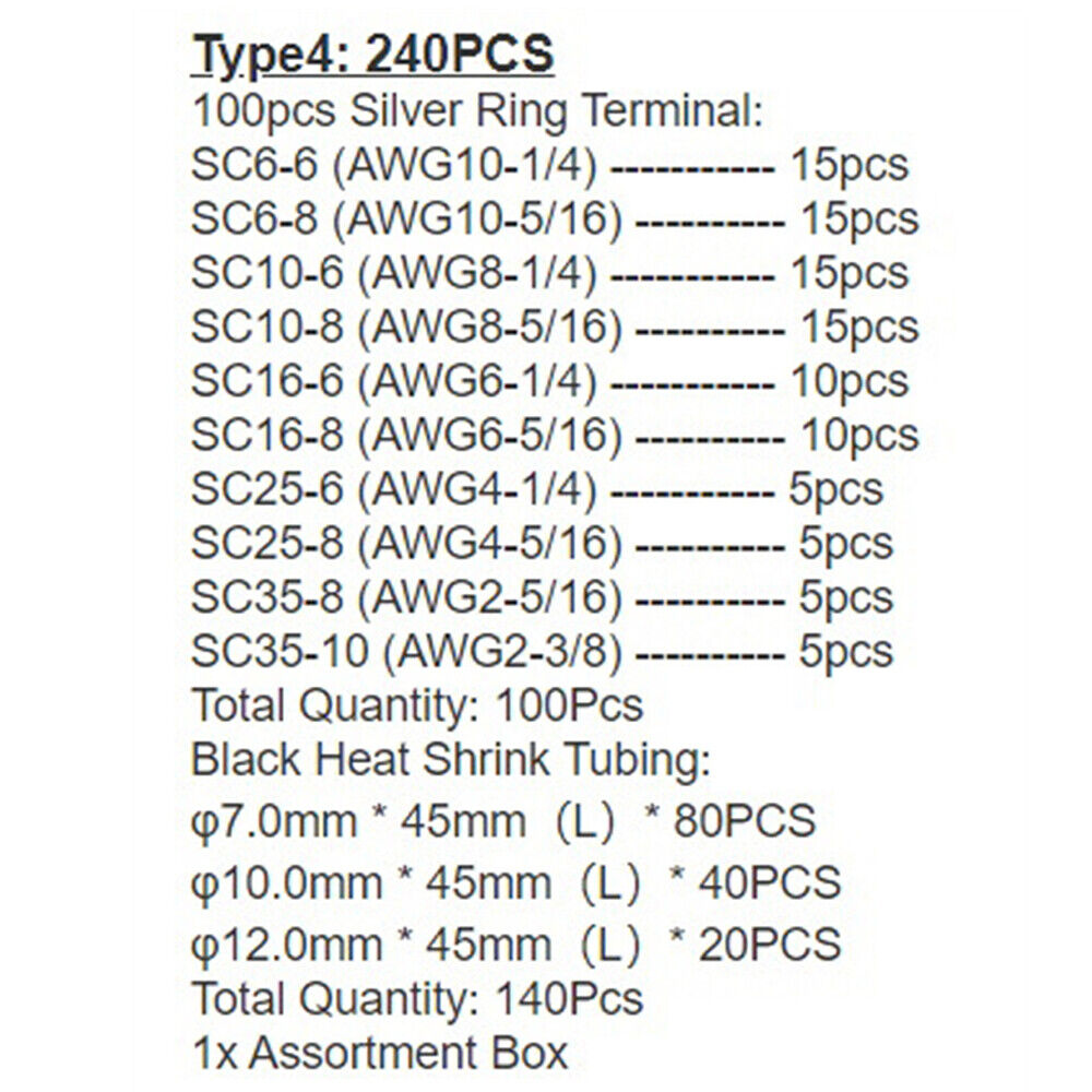 Package Includes: 240 PCS SC6-SC35 Terminals+Heat Shrink Tube SC6-6 (AWG10-1/4) ----------- 15pcs SC6-8 (AWG10-5/16) ---------- 15pcs SC10-6 (AWG8-1/4) ----------- 15pcs SC10-8 (AWG8-5/16) ---------- 15pcs SC16-6 (AWG6-1/4) ----------- 10pcs SC16-8 (AWG6-5/16) ---------- 10pcs SC25-6 (AWG4-1/4) ----------- 5pcs SC25-8 (AWG4-5/16) ---------- 5pcs SC35-8 (AWG2-5/16) ---------- 5pcs SC35-10 (AWG2-3/8) ---------- 5pcs φ7.0mm * 45mm(L)* 80PCS φ10.0mm * 45mm(L)* 40PCS φ12.0mm * 45mm(L)* 20PCS